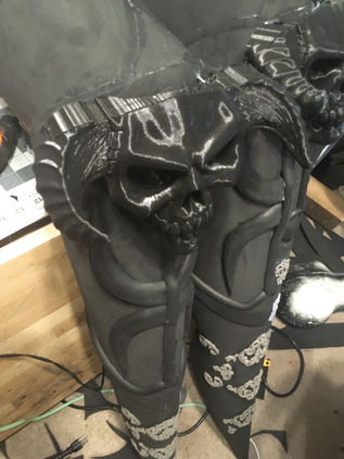 Can't be a spider without a set of spider legs, but the weird thin about the whole design is that there are only six legs, I guess with my two human legs under the skirt that makes eight in total? We'll skip formalities for now and get right down to business. The structure is all free hand built. I wanted to make the legs look like actual legs and gave them the right curvature (this took a few tries), after making the two pieces (and one fun tiktok later) I glued the pieces together and added the extra details, 3d printed demon skulls and eva foam clay pieces. Paint, shade and gems finished these space consuming appendages.
